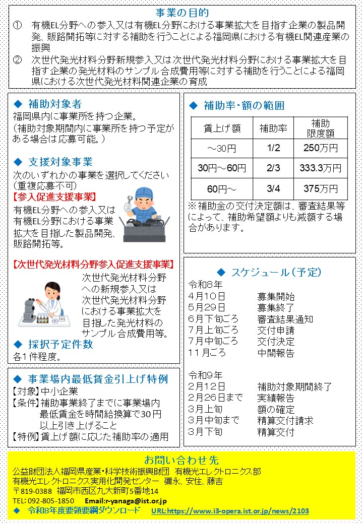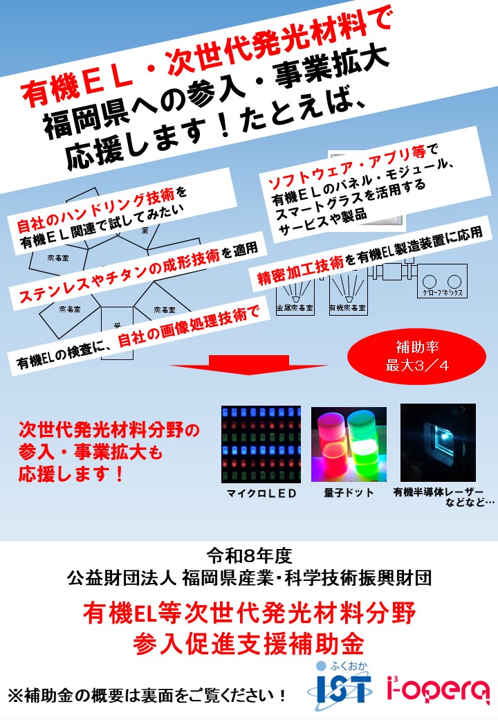有機光エレクトロニクス実用化開発センターでは4/10(金)より『令和8年度 有機EL等次世代発光材料分野参入促進支援補助金』の公募を開始いたします。